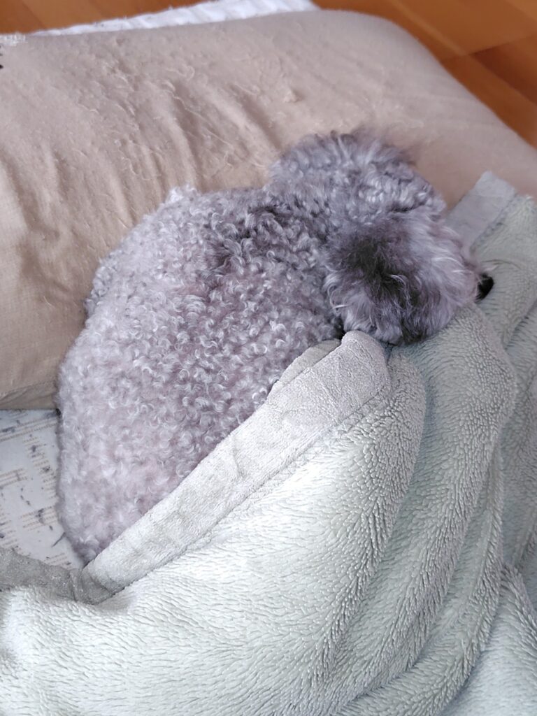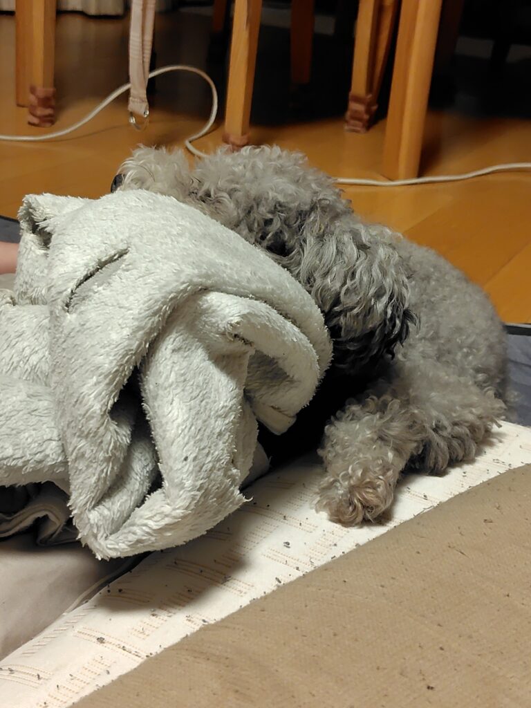 眠いけどまぶしいからお気に入りの毛布で顔を隠してついでに顎置きにして寝てます。
